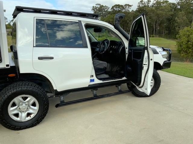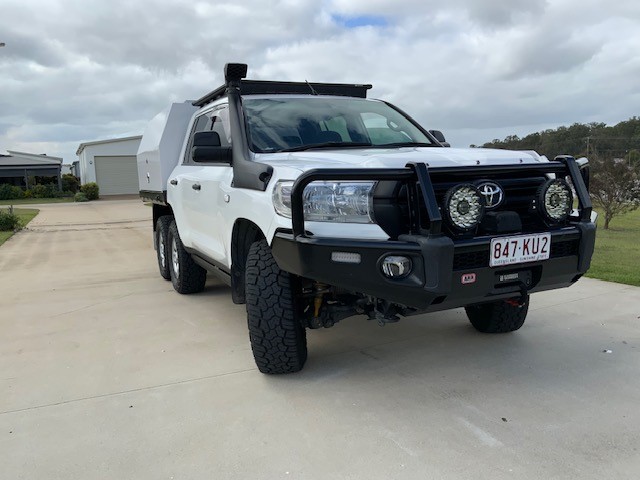 ARB Summit bullbar with Fog lights and Led spotlights 2” lift with King Springs , diff drop kit, Bilstien shocks Adjustable rear axle radius arms Catch can and second diesel filter Just Autos Nambour did a mild tune Stockwell automatic torque converter lockup kit Extra USB plugs fitted Scan gauge MSA electric extendable mirrors Redarc brake controller Long range tank fitted total fuel 280 litres Two cameras fitted hookup and rear vision Clear view electric side steps
