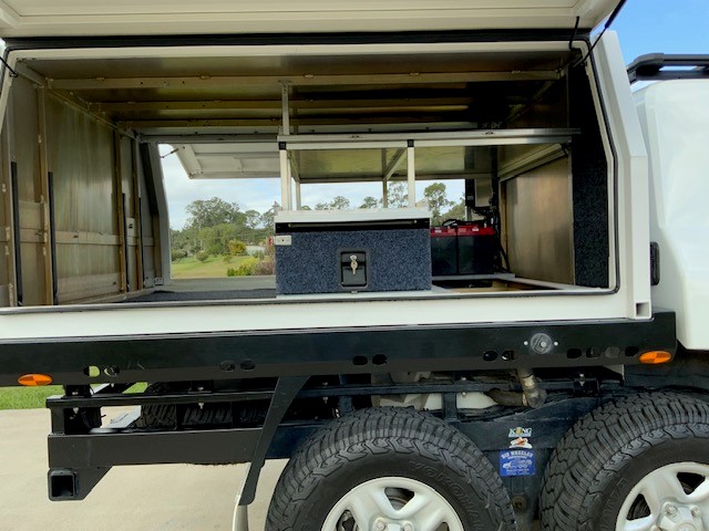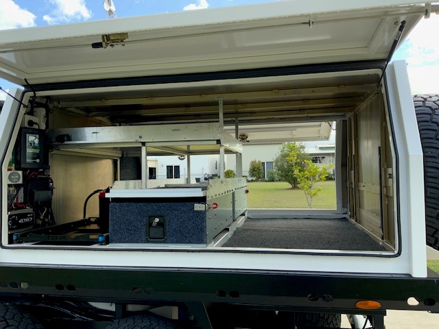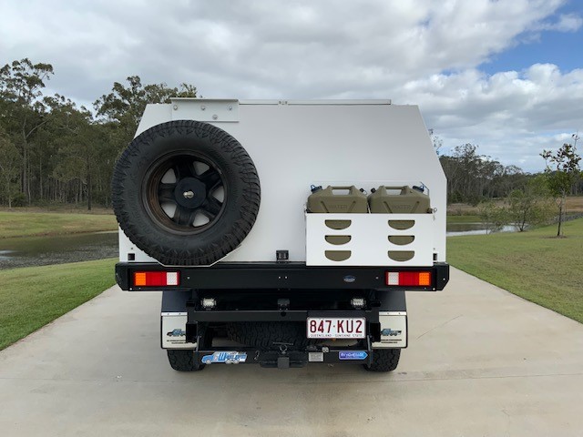 1 x spare tyre under tray and 1 x spare on rear of canopy Twin Jerry can holders on rear LED touch light and USB points