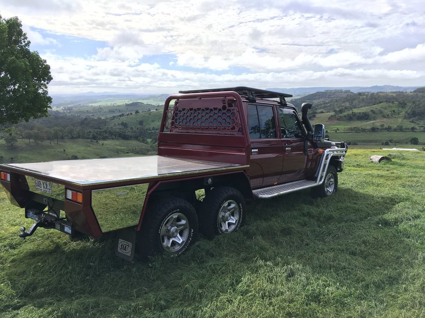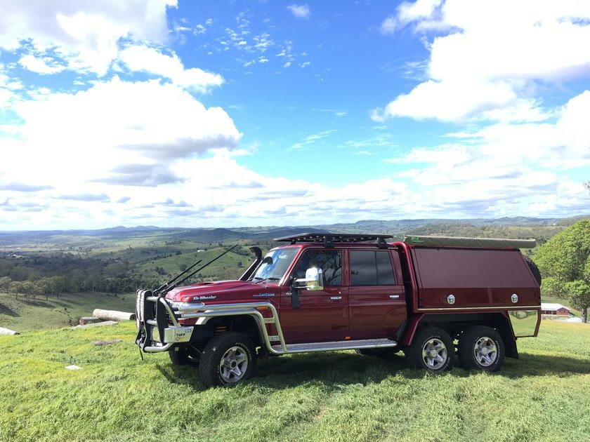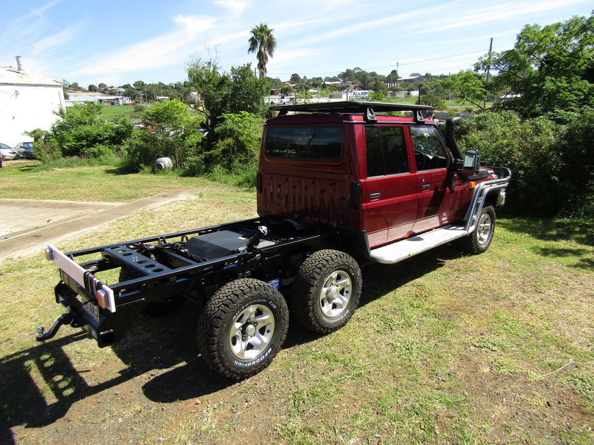 Starting off with a Merlot dual cab Landcruiser, that was fitted with the polished bull bar and side rails, we gave it an ADR approved rear track correction, then six wheeled it to take the GVM to 4,495Kg and towing to 4,500Kg.
